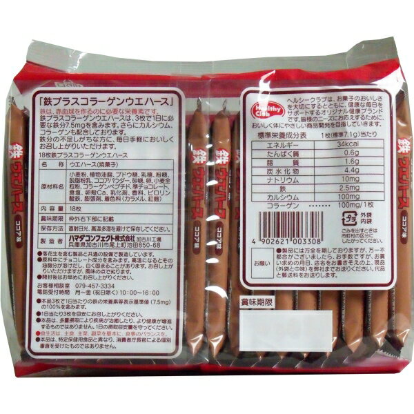 ハマダコンフェクト株式会社個装サイズ:200X180X40mm個装重量:約140g内容量:18枚入【発売元:ハマダコンフェクト】【栄養機能食品(Fe)】【名称】ウエハース(焼菓子)【原材料名】小麦粉、植物油脂、ブドウ糖、乳糖、粉糖、脱脂粉乳、ココアパウダー、砂糖、卵、小麦全粒粉、コラーゲンペプチド、準チョコレート、食塩、卵殻Ca、乳化剤、香料、ピロリン酸鉄、膨張剤、着色料(カラメル、紅麹)【栄養成分表(1枚(標準7.1g)あたり)】エネルギー・・・34KcaLたんぱく質・・・0.6g脂質・・・1.6g炭水化物・・・4.4gナトリウム・・・10mg鉄・・・2.5mgカルシウム・・・100mgコラーゲン・・・100mg【ご注意】・本品3枚で1日当たりの鉄の栄養素等表示基準値(7.5mg)の100%を含みます。