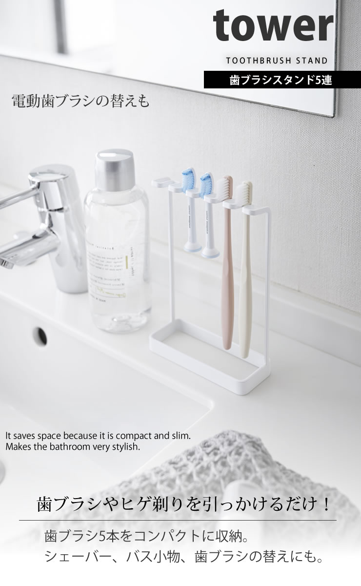 歯ブラシスタンド 5連 タワー(tower) / 山崎実業 YAMAZAKI 仕様 サイズ:約幅12.5cm×奥行5cm×高さ18.5cm 商品重量:約190g 耐荷重:1ホルダー約250g 材 質:スチール(粉体塗装+ユニクロメッキ) 滑り止め:シリコーン デザイン:日本/原産国:中国 ※WEB上のため、実物と画像の色が、多少違う点がございます。