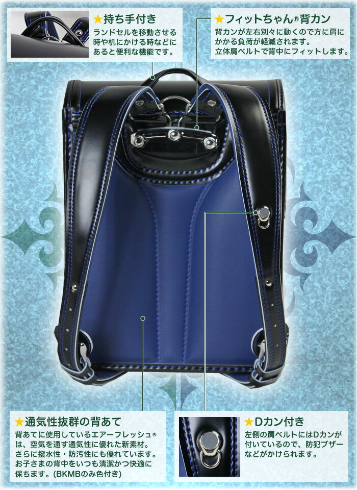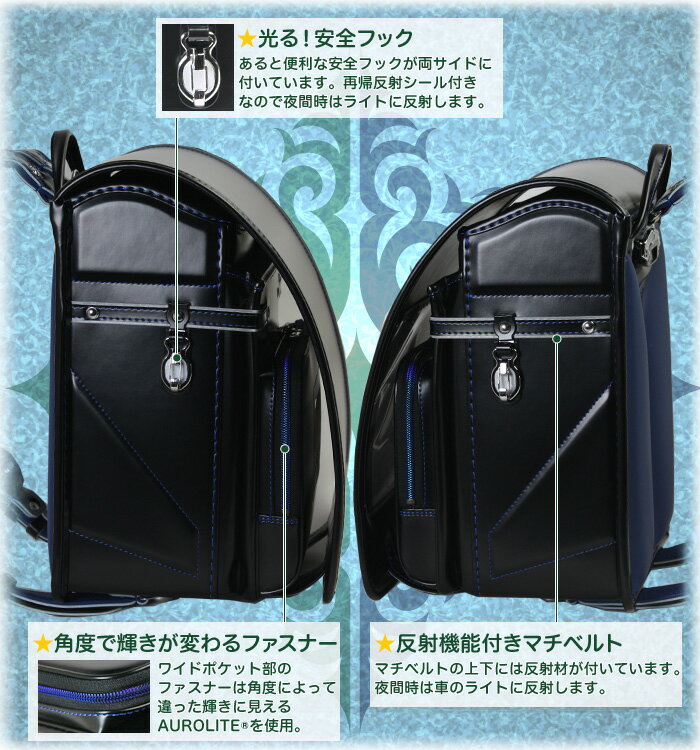 左肩ベルトに反射Dカン(防犯ブザー取り付け部)つき、両側面に反射ナスカンつきなど、通学時の子供の安全を考慮した設計です。